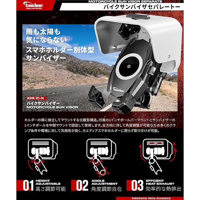 Kaedear(カエディア) バイク サンバイザー 日除け サンシェード 自転車 スマホホルダー 携帯ホルダー スマホ ホルダー スタンド マウント サンバイザー セパレート KDR-V1-M-BK (25.4㎜/ブラック)