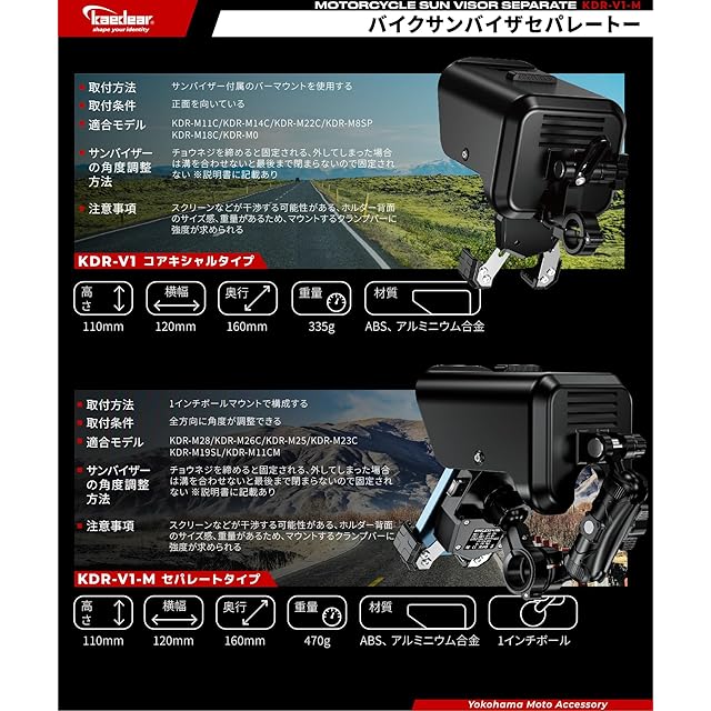 【商品詳細】 ■サイズ:高さ110mm、横幅120mm、奥行160mm(バイザー部分) ■材質:ABS、 アルミニウム合金 ■重量:KDR-V1/335g、KDR-V1-M/470g ■内容:KDR-V1/サンバイザー(ボルト固定)、17mmボールバーマウント(径32mm/貫通タイプ)、アタッチメント(12/22/25.4mm)、2mmラバーテープ、レール KDR-V1-M/サンバイザー(1インチボール)、1インチボールバーマウント(径32mm)、アタッチメント(12/22/25.4mm)、2mmラバーテープ、中間マウント90mm ■ご注意:⑴スマホホルダーは付属致しません。⑵スマホ機種や使用用途によっては効果を体感できない場合があります。⑶調整箇所が多く、DIYでの取り付け難易度が高く感じられる場合があります。⑷車種特有のハンドル周りの条件等により取り付けが難しい場合があります。車種特有の足回りの性能や走行条件により、サンバイザーが下がってきたり、動いたりする場合があります。