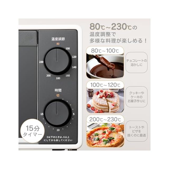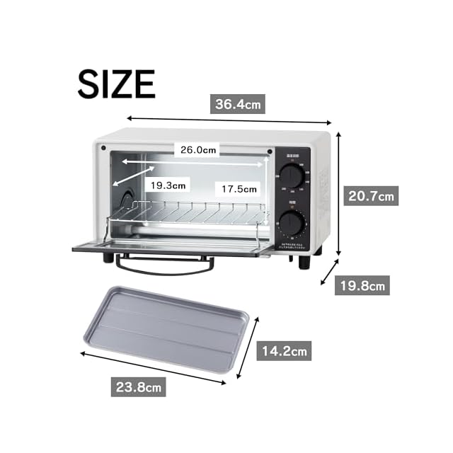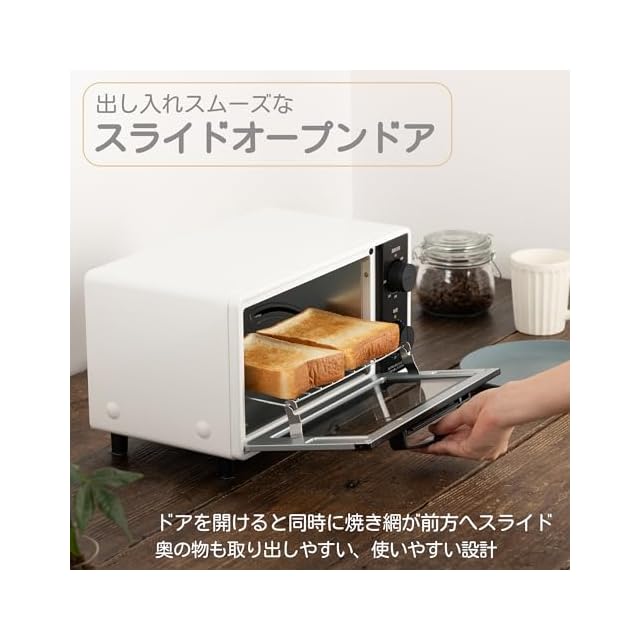 【使い勝手よい】温度・タイマー調整はつまみを回すだけで実現できます。それに、スライドオーブンドア設計で、扉を開けると、焼き網が手前へスライドしてくるので、焼きピザーなどが取り出しやすい。また、脱着式の焼き網・パンくずトレーなどの部品は簡単に着脱でき、お手入れや掃除がしやすいモデルです。