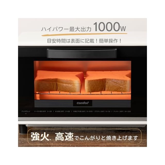 【商品仕様】COMFEE' オーブントースター:◇コンパクトなサイズ:幅36.4x奥行19.8x高さ20.7cm、約2.7Kg◇容量:8L、トースト2枚焼き ◇電源:AC100V ◇最大出力:1,000W ◇タイマー:最大15分◇加熱モード:遠赤外線◇温度調整範囲:80℃~230℃◇電源コード長さ:1.1m◇付属品:パンくずトレイ・受け皿・日本語取扱説明書※ 製品期間:一年間