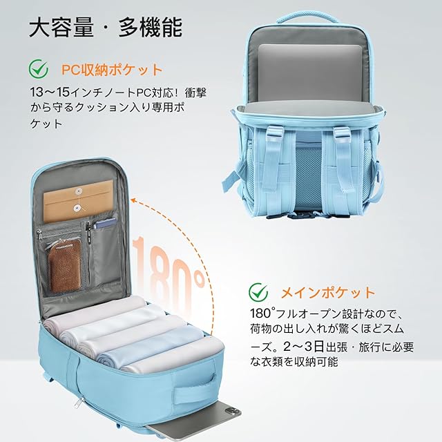 【ストレスフリーな使い心地】180度フルオープン設計のメインポケットで、荷物の出し入れが驚くほどスムーズ。USB充電ポート:移動中もスマホを充電可能(バッテリー別売)。3Dメッシュバックパネル:通気性抜群で、通勤ラッシュでも背中が蒸れない。二重補強ショルダーストラップ:最大15kgまで耐荷重、肩への負担も50%軽減できます。