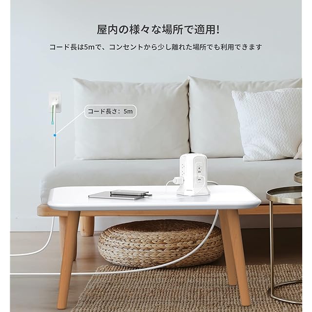 NVEESHOX 電源タップ タワー型 usb コンセント Type-C付 延長コード 5m 雷ガード 9個AC口 4個USBポート テーブルタップ OAタップ たこあしコンセント 過負荷保護 安全保護機能 自宅用 会社用 ホワイト…