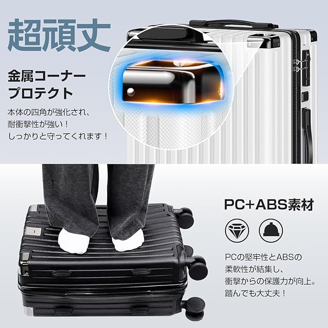 【耐衝撃・静音キャスター・調整可能キャリバー】金属コーナープロテクト付きで、本体の四角が強化され、耐衝撃性が強い!しっかりと守ってくれます!高弾性TPE衝撃軽減素材のキャスターを採用し、より静かで耐摩耗性も向上しています。スムーズな滑りを実現しながら、360度の自由回転もできます。ボタン一つでキャリーバーの高さを調節できます。Sは2段階調整、MとLは1段階調整可能のハンドル キャリーバー、耐久性も抜群。