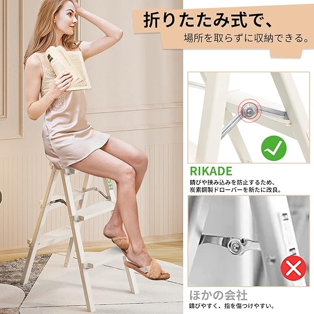 RIKADE 脚立3段 梯子 アルミ 折りたたみ ミニ 軽量 踏み台 安全 三段 耐荷重150KG 滑り止め付き ステップ台 (ホワイト三段)