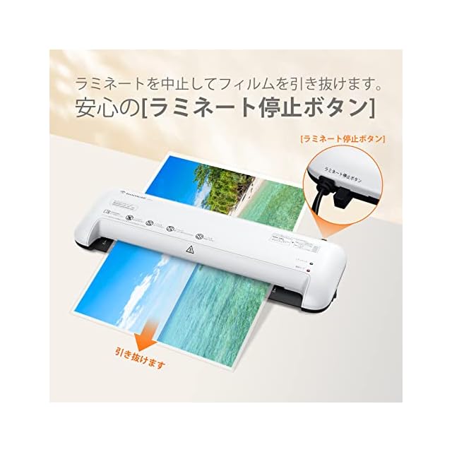 【3in1多機能A3ラミネーター】①A3やA4メニューはもちろん、A5POPや写真サービス判・名刺・IDカードなどの小さいサイズも対応可能です。②「ペーパートリマー」&「コーナーパンチ」付き、気楽に自宅でお好きなサイズにDIYし、指を傷つけません。③フィルムが詰まった時は「ラミネート停止ボタン」を押せば、フィルムを取り出せます。