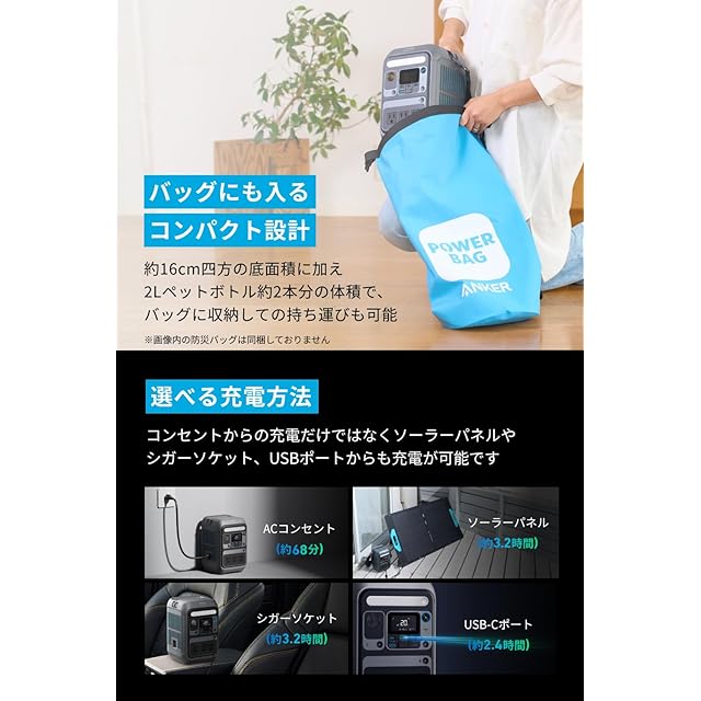 コンパクトかつパワフルなポータブル電源:約16cmの四方の底面積に加え2Lペットボトル約2本分ほどのコンパクト設計を実現。バッグに収納しての持ち運びや、玄関のシューズボックスへの収納など、高い携帯性と収納性を備えています。ACポートからは最大300W、USB−Cポートからも最大140W出力が可能。ノートPCへの急速充電はもちろん、テレビや電気毛布など停電時でも様々な機器へ給電 / 充電できます。