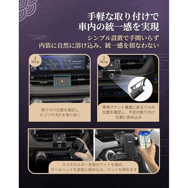 【手軽な取り付けで車内の統一感を実現】LUWUのハリアー専用スマホホルダーは、ハリアー 80系専用にデザインされており、インテリアに完璧にフィットします。特別な工具や複雑な手順は必要なく、取り付けが非常に簡単です。専用設計により、車内のインテリアと調和し、統一感を演出します。これにより、クリーンでスタイリッシュな空間を保ちながら、機能性も確保。快適なドライブをサポートします。