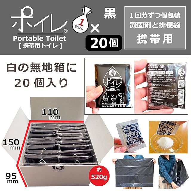 ポイレ 携帯トイレ 個包装 (黒, 20個) 【 凝固剤 排便袋 】 日本製 防災グッズ 災害用 非常用 備蓄 抗菌 消臭 可燃処理 15年保存