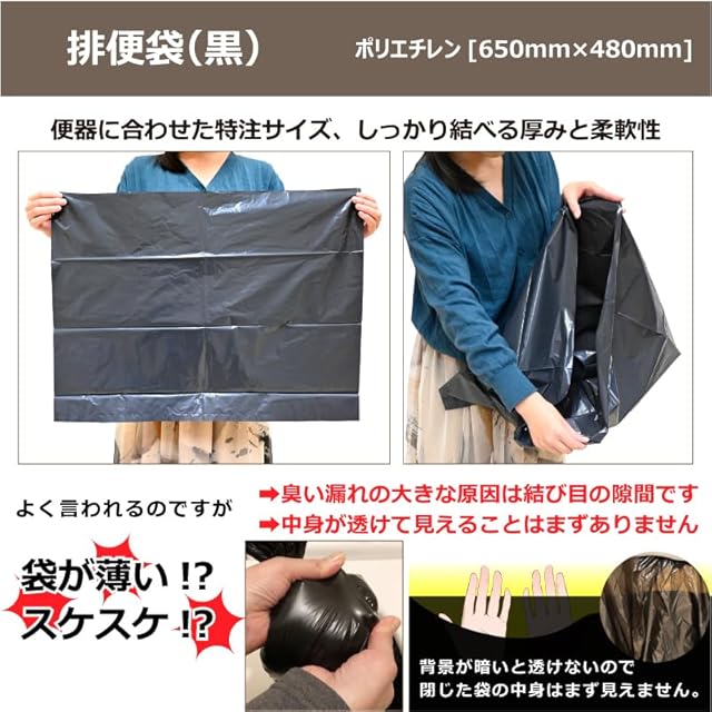 【 排便袋について 】排便袋は日本の家庭用トイレに合わせたサイズ(約650×480mm)で、便器にかぶせて使用可能。黒色ポリエチレン製で中身が透けにくく、しっかり結べる厚み。 簡易トイレとして非常時でも使いやすいよう設計されています。「袋が薄い」と感じられることがありますが、臭い漏れの主因は厚さではなく結び目の隙間や袋の材質・構造です。 数ミクロンの厚さの差で選ぶより、防臭性能が必要な場面では専用の防臭袋との併用をおすすめします。 お子様や高齢の方でも扱いやすく、処理しやすいバランスを意識した仕様です。 ※静電気や湿気により袋が開きにくい場合があります。 指を湿らせる、または開け口を揉み合わせると開きやすくなります。