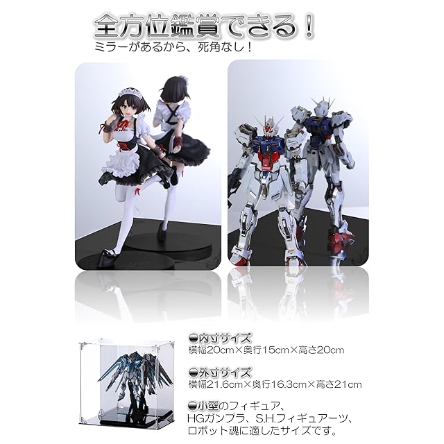 【サイズを決める】● 内寸サイズ:横幅20cm×奥行15cm×高さ20cm ● 外寸:横幅21.6cm×奥行16.3cm×高さ21cm ● 展示ケースの推奨寸法は飾る物の(幅・奥行×1.1)+5cm、(高さ×1.1)+2cm ● プライズフィギュア、HGガンプラ、S.H.フィギュアーツ、ロボット魂に適したサイズです。