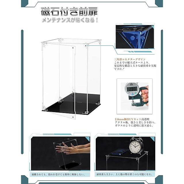 【UVから守る】フィギュアの日焼けによる劣化を防ぐUVカット加工を施している。UVカット率99.3%以上(※ISO9050準拠)、紫外線からのダメージをしっかりガードできる!● 壊れにくい、厳選した厚さ2.8mmの高透明アクリル素材を使用、貴重なコレクションを確実に保護します。