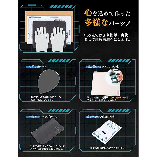 【安心できる】 ● デザイン特許を取得した三角形コネクター固定構造設計は、はめ込み式展示ケースよりも安定しており、運搬されても、揺れを受けても簡単に解体しない ● 耐荷重も大きい、上にさまざまなアイテムが置けます ● アクリル板に角丸加工を施します、手に優しい ● オリジナルの組み立て工具、特製クリーニングクロスや手袋が付属しており、簡単に組み立てや分解ができます。