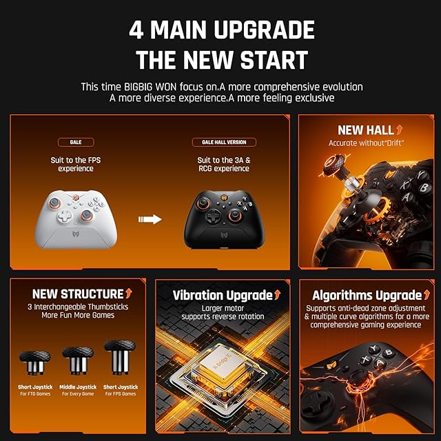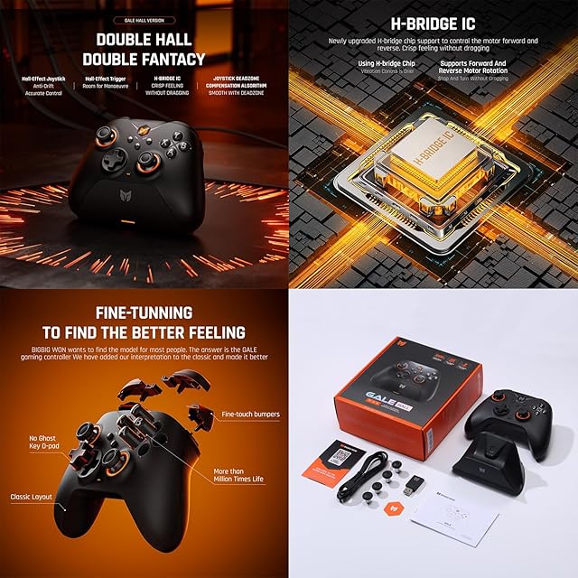 【多機能ゲーミングコントローラー】Switch、PC Windows10&11、Android、iOS用Gale HallワイヤレスPCコントローラーは、4つのカスタムバックボタン、ホールジョイスティック、ホールトリガー、6軸ジャイロモーションコントロール、1000Hz有線ポーリングレート、ターボ、マルコ、 255レベル調整可能な振動、Hブリッジチップ、アンチデッドゾーンアルゴリズム、キーボードマッピング、スクリーンショット、1000mAhバッテリー、スマート充電スタンド、PCアプリ。 BlGBlG WON は、Gale Hall switch コントローラーのより包括的な進化に焦点を当てています。