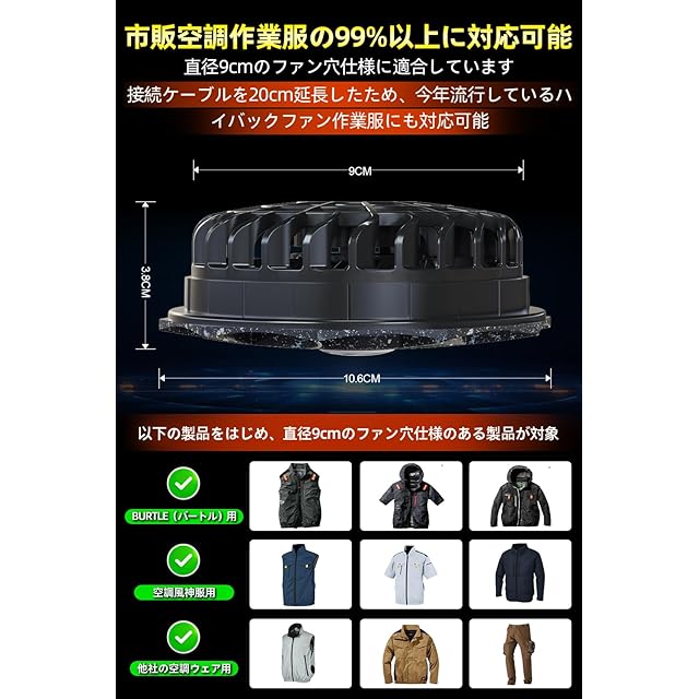 【業界最強風量×トレンドリーディングな多面体カバーデザイン】日本技術の核心であるダブルボールペアリングモーターに、IP45防塵防水仕様と42V高出力バッテリーを最適連動。従来品を凌駕する瞬間風量219CFM/秒を実現し、炎天下の作業現場からアウトドアアクティブまで、あらゆるシーンで瞬時に体感できる「肌に届く疾風」を約束します。デザイン面では唯一無二の多面体カバーを採用、市販全9cm取り付け穴径の空調作業着対応の汎用性を持ちながら、機能性とスタイリッシュの融合で、仲間から「それどこで買った?」の注目を独占。さらにメンテナンス面では革命的な進化を実現、着脱式構造でカバーの清掃やメンテナンスもラクラク!お客様の声に応えて付属されている接続コードを20cmロング化、さらに今年急成長中のハイバック型空調ウェア市場にいち早く対応!