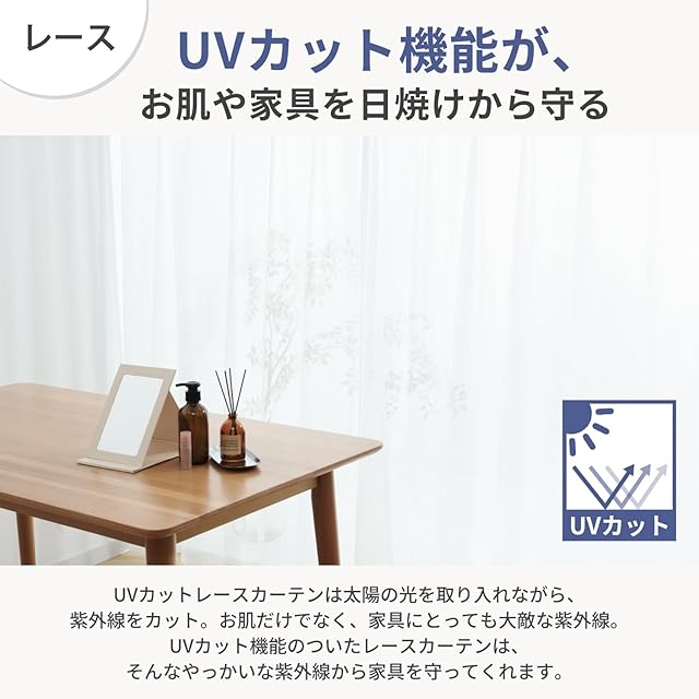 【プライバシー保護・UVカット】ミラーレースカーテンは、軽く透け感のある薄めの生地を採用し、外の景色を楽しみながら、プライバシーも保護してくれます。そして、UVカット機能がついて、太陽の光を取り入れながら、紫外線をカット。お肌や家具を日焼けから守ってくれます。