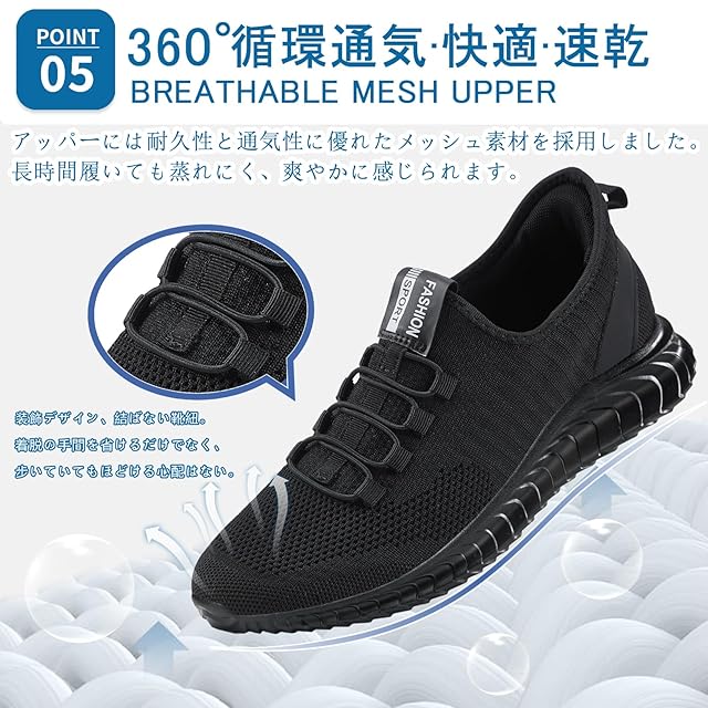 【抜群の通気性&超軽量設計】アッパーには通気性抜群のメッシュ素材を採用。長時間履いても蒸れにくく、夏場でも快適に過ごせます。歩くたびに空気が循環し、足元を常に爽やかに保ちます。さらに、足の形にしっかりフィットするデザインで、外反母趾や甲高に悩む方にもぴったり。片足わずか約180gの超軽量設計で、まるで足と一体化するような柔らかな履き心地を実現。軽快なフットワークで、立ち仕事や通勤、長時間の移動もストレスフリー。軽くて疲れにくいので、毎日快適に過ごせます。普段使いからレジャー、スポーツシーンまで、万能に使える一足です。