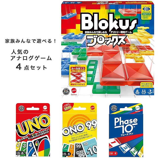 【セット内容】①ブロックス BJV44 (原産国:ベトナム、対象年齢:7才以上、プレイ人数:2~4人) ②ウノ(原産国:中国、対象年齢:7才以上、プレイ人数:2~10人)③オーノーナインティナイン HHL37(原産国:中国、対象年齢:7才以上、プレイ人数:2~6人) ④フェーズテン HCF91(原産国:中国、対象年齢:7才以上、プレイ人数:2~6人)