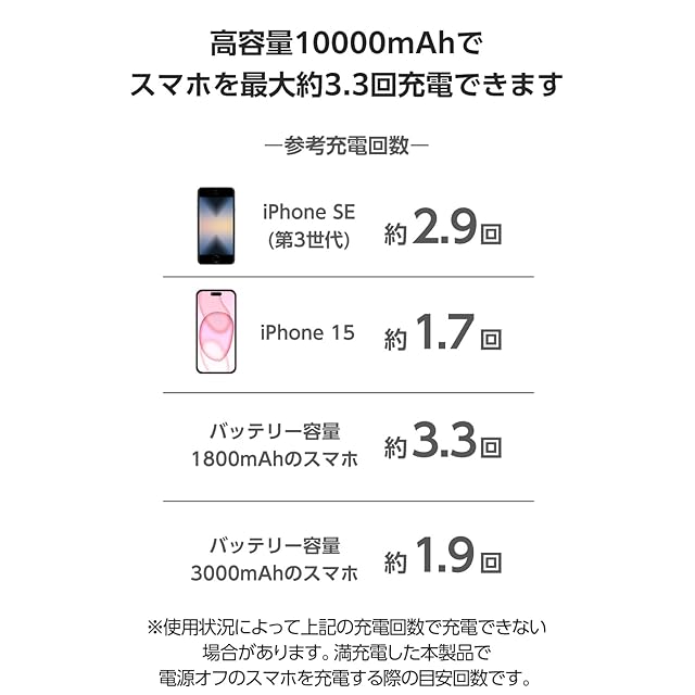 本製品(バッテリー容量10000mAh)で、1800mAhのスマートフォンを約3.3回、3000mAhのスマートフォンを約1.9回充電可能です。