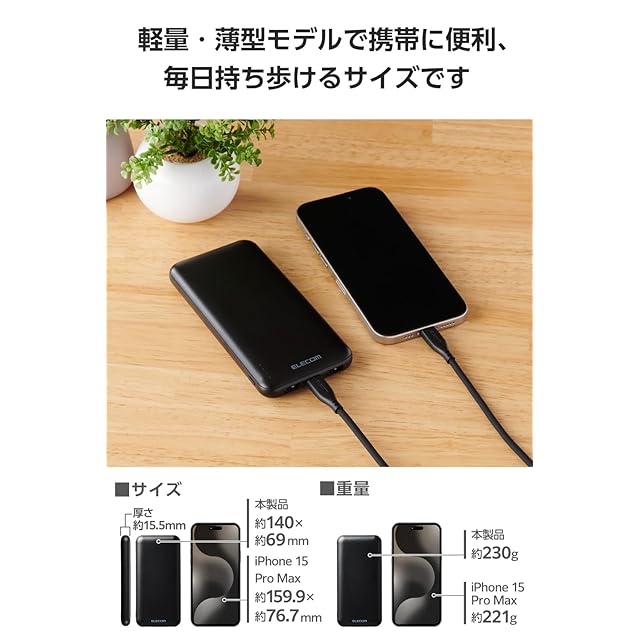 たっぷり使える10000mAhで長時間の外出時も安心。持ち運びしやすい薄型形状のモバイルバッテリーです。