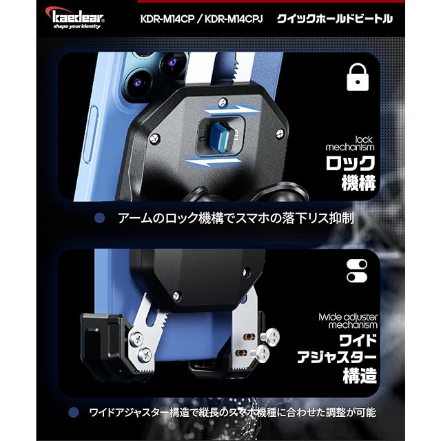 Kaedear(カエディア) バイク スマホホルダー バイク用 携帯ホルダー 振動吸収 マウント 付属 / 厚さ15mmまで, 縦長スマホ, カメラ突き出し,対応/大きめのスマホも脱着スムーズ/中央ボタンパット式/アームロック機構, クイックホールドビートルⅡ/Airアブソーバー KDR-M14CPJ-BK