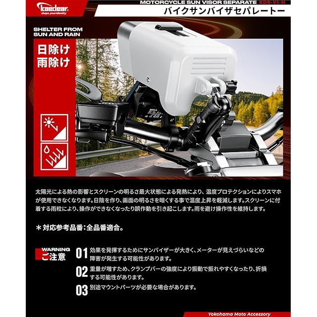 【日除けや雨除けとして】 夏のツーリングでは太陽光による熱の影響とスクリーンの明るさ最大状態による発熱により、 スマホの温度プロテクションが作動してスマホが使用できなくなります。 サンシェードで日陰を作り、画面の明るさを下げる事でスマホの温度上昇を軽減します。雨のツーリングではスマホのスクリーンに付着する雨粒により、画面操作ができなくなったり誤作動を引き起こします。サンバイザーが雨を避けスマホの操作性を維持します。 ご注意:⑴効果を発揮するために最低限必要なサイズとなります。思ったよりもサンバイザーが大きく、メーターが見えづらいなどの障害が発生する可能性があります。⑵重量が増すため、クランプバーの強度により振動で振れやすくなったり、折損する可能性があります。対応品番KDR-H3/KDR-H4W/KDR-HB1/KDR-HB2/KDR-HB2L/KDR-HB3/KDR-HB4、非対応:KDR-H3-2(振れやすい)/KDR-H4-2(重量超過)/KDR-H4-3(重量超過)/KDR-H4S(重量超過)。⑶別途マウントパーツが必要になる場合があります。