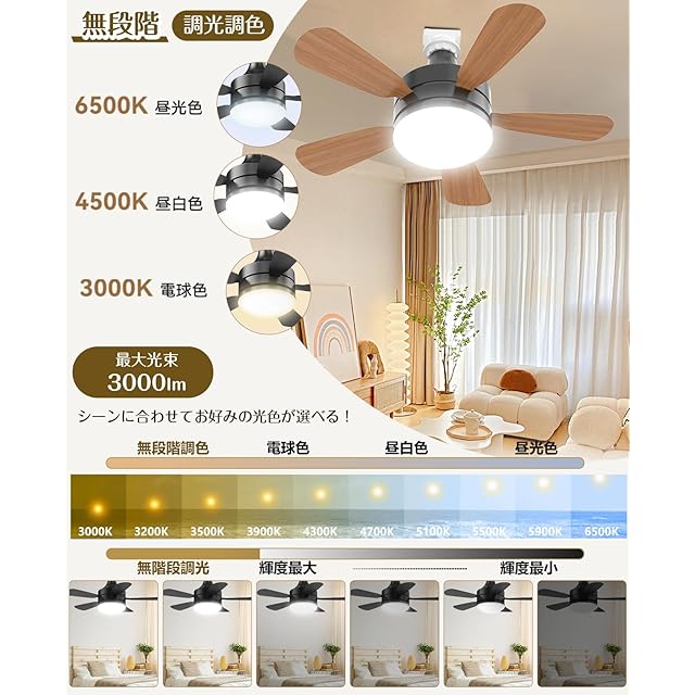 【正逆回転・無段階調光調色&3段階風量調節】小型シーリングファンライトは、先進の「正逆回転機能」を搭載したマルチシーズン対応モデルです。夏季には時計回りで直進性の強い涼風を発生させ、体感温度を最大3℃ダウンさせる体感冷却効果を発揮。冬季には反時計回り運転で天井に向かって気流を送り、暖房の熱気を部屋全体に均一に拡散させる「ヒートミックス機能」を採用しています。また、風量調節は「弱」「中」「強」の3段階から選択可能。高演色性LEDを採用した3色(3500k-6500k)も明るさを10%~100%も無段階的で楽に切り替えできます。無階段調光を組み合わせると多種類の光を実現!色や明るさが少しずつふわっと変化していくことによって、瞳への刺激も少なく、部屋の心地よい雰囲気を演出できます。