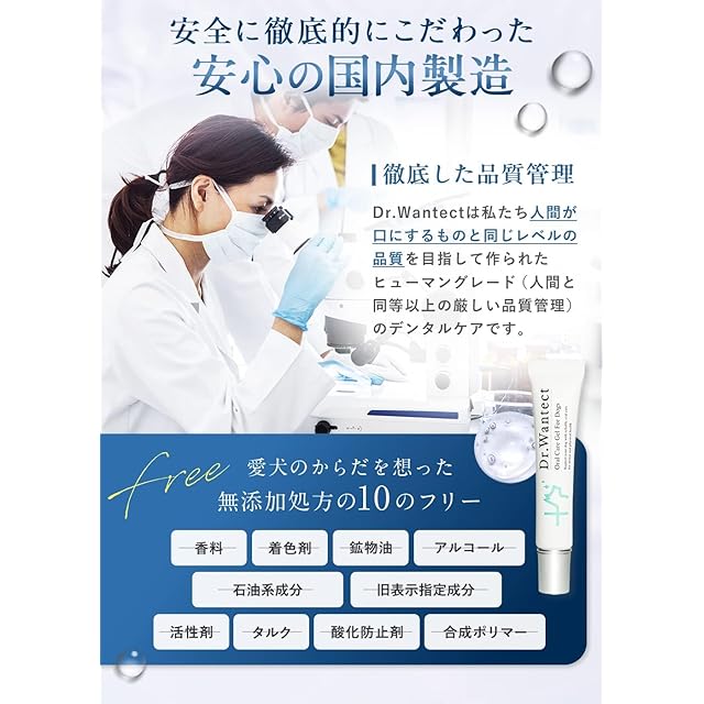 【安全性へのこだわり】Dr.Wantect(ドクターワンテクト)は愛犬の健康にも考慮した無添加のヒューマングレード。95%の厳選された天然由来成分で構成された国内製造の犬用 歯磨き粉(ジェル)。そのため安心してお使いいただけます。