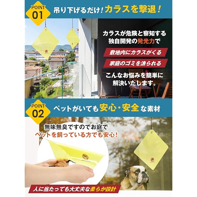 【商品説明】簡単設置・安心・安全な設置でカラスを撃退!ゴミ置き場、農家、神社、公園などお困りの場所に吊り下げるだけでカラスの目を刺激しカラスを撃退する新しい技術です。9年以上に渡り製品の開発に取り組みカラスの生体と習性を研究し安心・安全な形状で開発に成功いたしました。人や犬、猫などに影響がなく無味無臭な作りとなっており、また万が一飛んでいき人にあたっても安全な作りになっております。