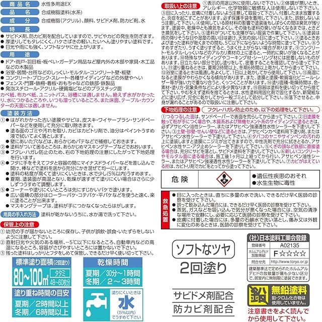 用途:(屋内外区分:屋内外用)ドア、雨戸、羽目板、板べい・ガーデン用品など屋内外の木部や家具・木工品などの木製品。浴室・居間・台所などのしっくい・モルタル・コンクリート壁・板壁。コンクリート・ブロック・スレート・各種サイディングなどの外壁やへい。フェンス・門扉・鉄柵・看板・おもちゃなどの鉄部・鉄製品。発泡スチロール・アクリル・硬質塩ビなどのプラスチック面。