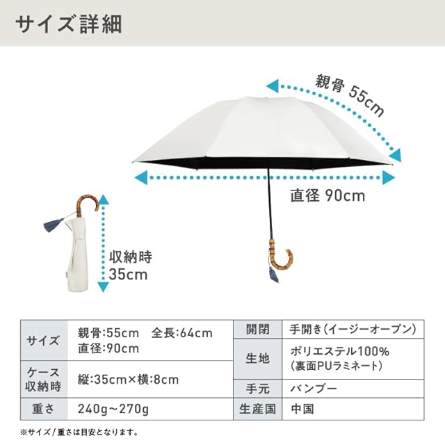 【持ち運びに便利な3段タイプの折りたたみ傘】 スタンダードの折りたたみ傘ながらも親骨55cmとサイズ感はしっかり大きめで、しっかりと日差しをカバーしてくれるサイズ感。 深張りタイプなので上品な丸みを帯びたドーム型シルエットも魅力です。 バッグに入れて持ち歩けば置き忘れることなく、必要な時に紫外線対策が可能に。 紫外線対策の道具としてだけではなくコーディネートのアクセントとしても楽しめるよう、傘をさす姿も美しくなるような大きさと色にもこだわりました。