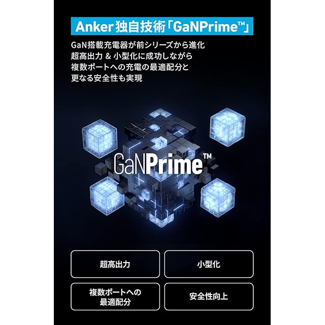 Anker最新の独自技術「GaNPrime」を採用:スイッチング周波数を高めて電子部品を省サイズ化。高出力でハイスペックながら、厳しい安全基準を満たしさらなる小型化に成功しました。