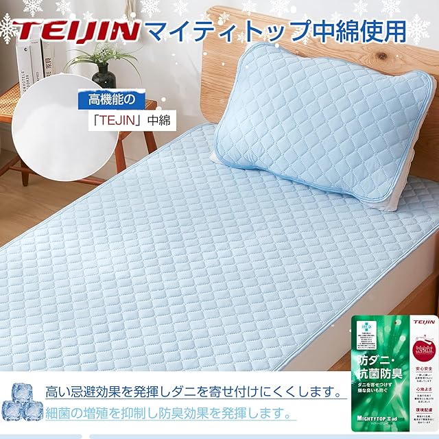 【抗菌防臭・吸放湿放熱】湿気や汗でジメジメする夏は、菌が繁殖しやすい季節です。中わたにテイジンの機能繊維「マイティトップII ECO」を使用する。抗菌防臭・防ダニ効果で安心。低ホルムアルデヒドなのでお子様にも安心。睡眠中に身体から発生する湿気汗や梅雨による湿気を吸湿し、外へ放湿してくれるので、ムレることなく爽やか。また、放熱性に優れているので熱がこもりにくく、背中の熱のこもりを感じにくく、快適な睡眠へ誘います。