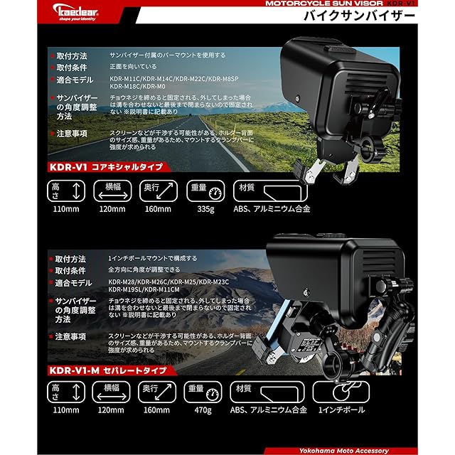 【商品詳細】 ■サイズ:高さ110mm、横幅120mm、奥行160mm(バイザー部分) ■材質:ABS、 アルミニウム合金 ■重量:KDR-V1/335g、KDR-V1-M/470g ■内容:KDR-V1/サンバイザー(ボルト固定)、17mmボールバーマウント(径32mm/貫通タイプ)、アタッチメント(12/22/25.4mm)、2mmラバーテープ、レール KDR-V1-M/サンバイザー(1インチボール)、1インチボールバーマウント(径32mm)、アタッチメント(12/22/25.4mm)、2mmラバーテープ、中間マウント90mm ■ご注意:⑴スマホホルダーは付属致しません。⑵スマホ機種や使用用途によっては効果を体感できない場合があります。⑶調整箇所が多く、DIYでの取り付け難易度が高く感じられる場合があります。⑷車種特有のハンドル周りの条件等により取り付けが難しい場合があります。車種特有の足回りの性能や走行条件により、サンバイザーが下がってきたり、動いたりする場合があります。