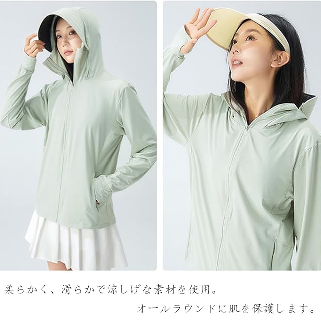 [HOTIAN] ラッシュガード メンズ レディース UVカットパーカー 接触冷感 夏 ラッシュパーカー 長袖 フード付き UPF50+ 日焼け対策ウェア アウター 軽量 通気性 体型カバー(XL・レディース用 グリーン)