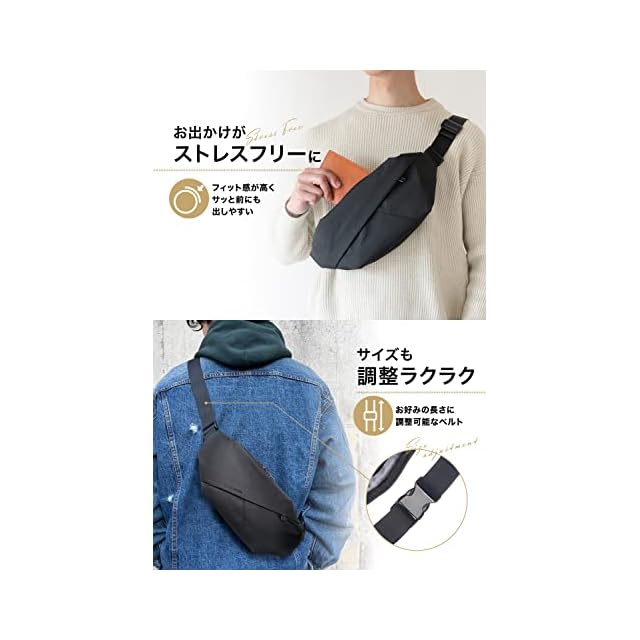 【機能的でもオジサンくさいのはイヤだ..】というお客様の声に応えたボディバッグ:意外とボディバッグに関しては、「おじさんくさい」「一昔前のデザイン」と思われるボディバッグが多かったりと、選び方が少し難しい部分もあるボディバッグ。時代や流行に左右されず、洗練されて、誰でも着けるだけで高見えするデザインを追い求めました。ユニセックスデザインのため、男性用 女性用 どちらも似合うデザイン。キッズや学生から 20代 30代 40代 50代ギフトやプレゼント用にも。また普段使いから海外旅行、ジム、ウォーキング、お散歩など幅広いシーンでも使えます。