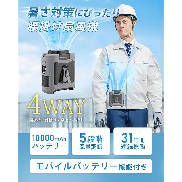 腰掛け扇風機 ベルトファン 10000mAh大容量【31時間連続使用&熱中症対策】5段階風量調節 USB充電式 携帯扇風機 首掛けLEDライト付き パワフル送風 暑さ対策 腰掛けクーラー 工事/配達/屋外作業/登山/キャンプ/アウトドア