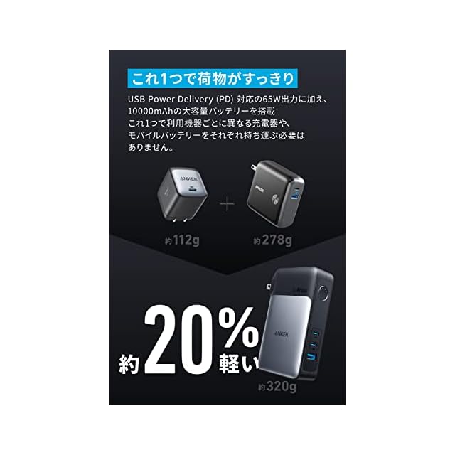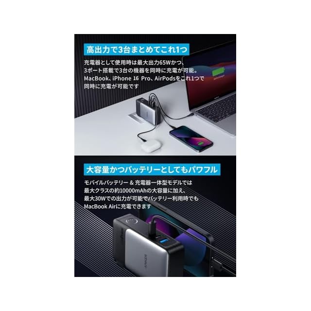 大容量かつバッテリーとしてもパワフル: 10000mAhの大容量で、 iPhone 16を約2回、iPad mini (第6世代) を約1回以上充電できます(※Anker調べ) 。充電器としては最大65W、バッテリーとしても30W出力での急速充電が可能です。
