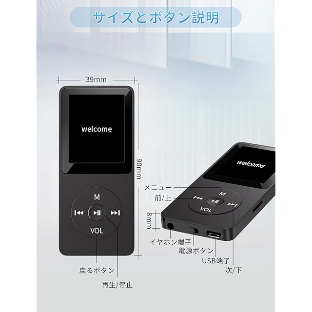 【付属品&】パッケージ内容:MP3プレーヤー X 1、USBケーブル X 1、日本語取扱説明書 X 1が付属しています。本製品の使用する前に、付属している日本語説明書をよく読むことを勧めます。本MP3はCE/FCC/RoHS認証取得済みです。弊社は製品の初期不良、自然故障、通常使用における不具合には1年間のが対応しています。本製品の使用過程に、何か不明なところがあれば、いつでも連絡してください。