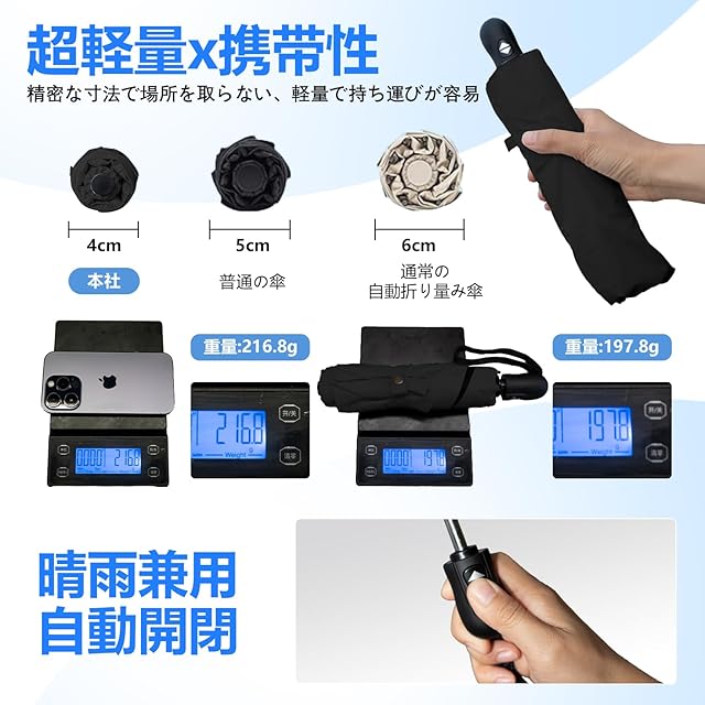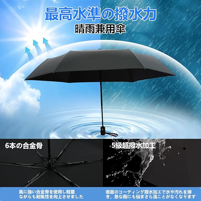 【晴雨兼用・強風や雨にも対応】持ち運びに便利な日傘兼用雨傘の折り畳み傘です、高密度の防水素材を使用した日傘です。 通常の傘よりも耐水性に優れ、軽く振るだけで雨が玉のように一気に落ちるので、他の人の邪魔になることもありません。頑丈な航空機用アルミ合金製の中棒と6本の傘骨にはグラスファイバーと航空機用アルミ合金を使用しており、耐久性にも優れています。強風で裏返っても元に戻ります。満員電車に乗る時に傘の水滴で衣服が濡れないよう周囲への配慮もバッチリ。スッキリした無地デザインで女性はもちろん、男性も違和感なく使える日傘です。男女兼用ワンタッチで自動開閉折り畳み傘です。