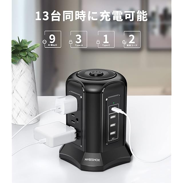電源タップタワー型 Type-C付 PD機能付き usbコンセント 延長コード 2m 雷ガード 9個AC口 4個USBポート たこあしコンセント テーブルタップ OAタップ 安全保護機能 自宅用 会社用 ブラック NVEESHOX