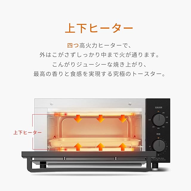 【ムラなく均一に焼ける】上下それぞれ2本のヒーターが搭載され、食材を効率よく加熱し、焼きムラができにくい。最大1200Wの高出力で、こんがりジューシーな焼き上がりを実現。
