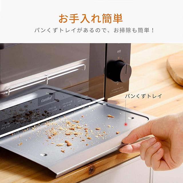 【お手入れ簡単】パンくずトレーは引き出して簡単に取り出せるため、楽にお手入れを行えます。付属の焼き網と受け皿も丸ごと水洗いでき、手軽にきれいな状態を保てます。