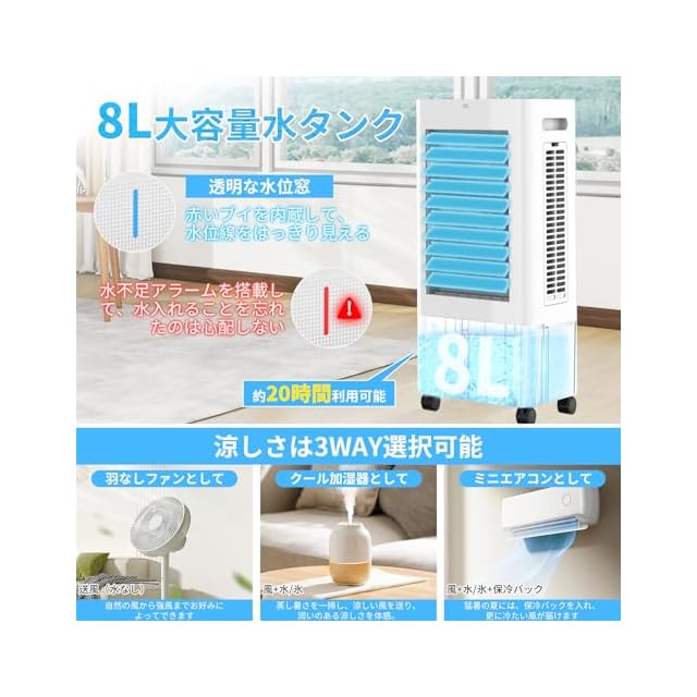 冷風機 強力 冷風扇 扇風機 【2025年猛暑対策・急速冷却・省エネ】イオン発生 8L大容量タンク 3方向で吸水し 強冷感UP 強力送風 工事不要 スポットクーラー 3つモード&3段階風量 静音 冷房LED液晶画面 自動首振り 24時間入・切タイマー 室内温度表示 水不足提示 氷入れ タッチ/リモコン付き キャスター搭載 移動便利 冷風機 強力 人気 空気清浄 スポットエアコン PSE認証済 白