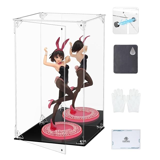 COOLTAKU フィギュアケース アクリル UVカット 背面ミラー マグネット式 磁石付き 前扉 コレクションケース より堅固 組み立て式 アクリルケース ディスプレイケース 防汚れ 手袋 クリーニング クロス付き (幅15×奥行15×高さ25cm, 黒い台座+背面ミラー)