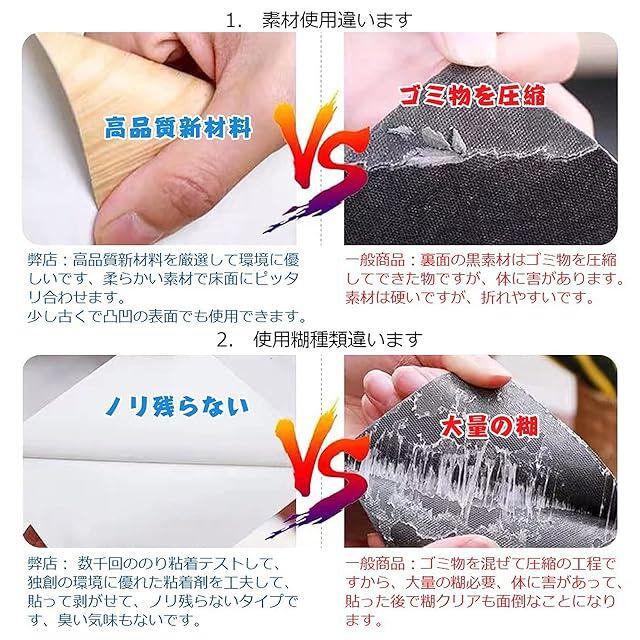 【防水滑り止め】フロアタイル表面には耐久性に優れた特殊クリア加工・抗菌加工に加え、防水、表面についた汚れは濡れ雑巾などでふき取ってください。滑りにくいです。