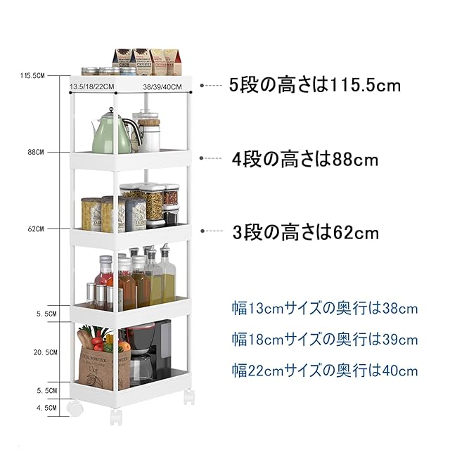 ★【どんな場面でも活躍】細身設計で部屋の隙間を活用できます、スペースを節約し充分利用します。調味料、洗剤、バスルーム用品を楽に収納可能です。キッチン、コンロ横、洗面所、美容室などの隙間に適用。洗面台と壁の間、冷蔵庫横、玄関などでの使用に最適です。狭い人や空間を有効利用したい人はぜひお試してください。