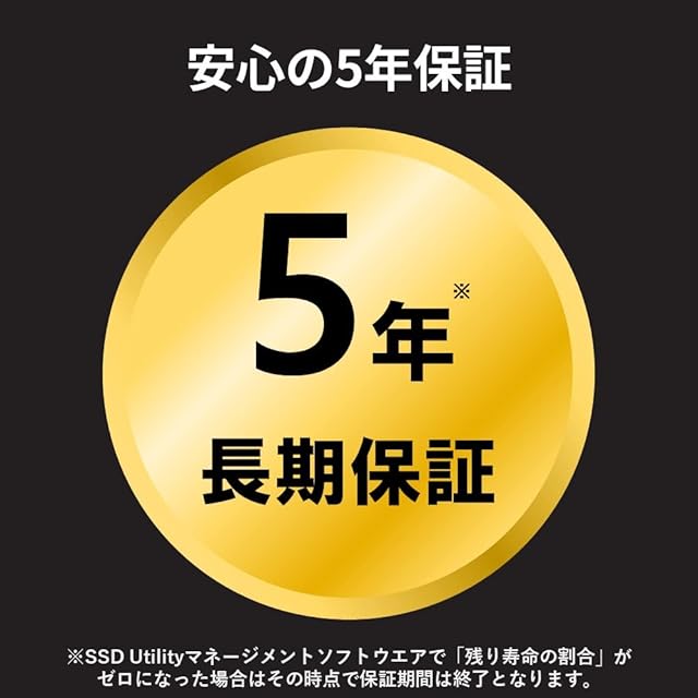 【国産メモリ搭載&長期5年】国内メーカーKIOXIA独自技術を採用した国産BiCS FLASHメモリを搭載し、安心の長期5年に対応。※ただし、SSD Utilityマネージメントソフトウエアで「残り寿命の割合」がゼロになった場合はその時点で期間は終了となります。※外付けケースを利用しての動作は行っておりません。