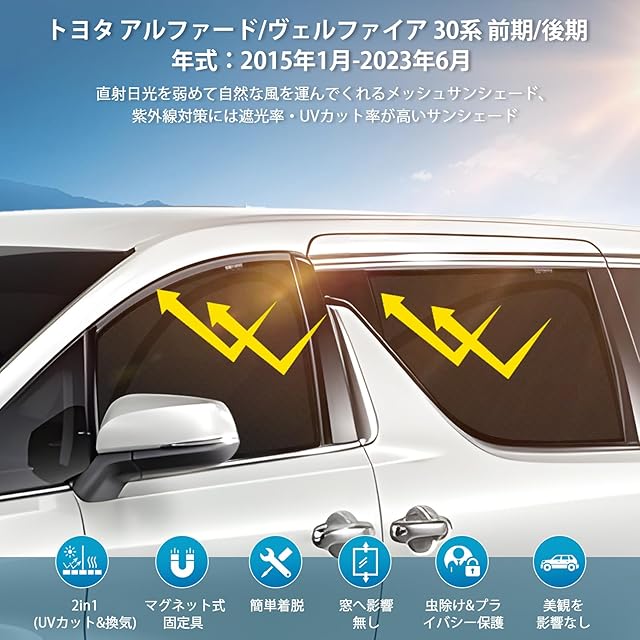 アルファード ヴェルファイア 30系 車種専用 メッシュカーテン サンシェード 遮光 換気 ALPHARD VELLFIRE 30 前期 後期 サイド用 2in1 カーテン 日除け 虫避け マグネット カーシェード 通風 UVカット運転席 助手席 インテリア アクセサリー カスタム 4枚