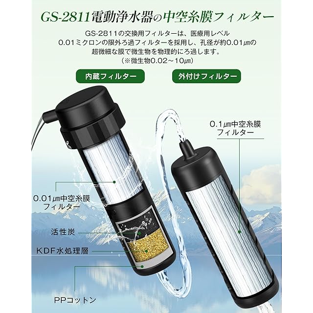 Greeshow GS-2811 電動浄水器 交換用フィルター 限外ろ過 内蔵、外付けフィルター 防災 携帯浄水器 アウトドア 濾過器 中空糸膜カートリッジ ブラック 内蔵フィルター1個と外付けフィルター1個【日本正規品】