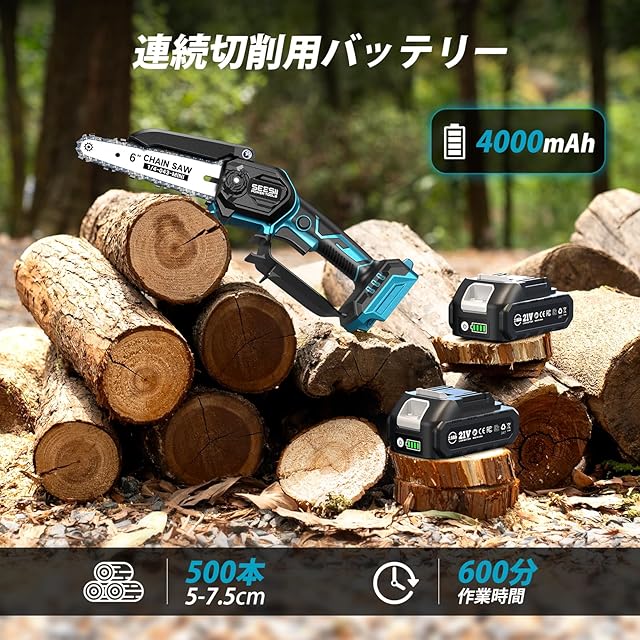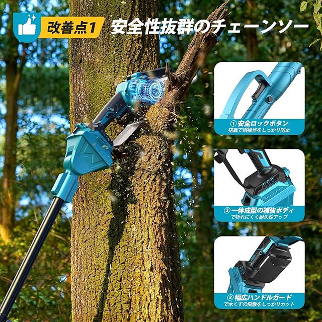 【充実のセット内容・安心の品質】■セット内容(各1点):電動ハンディチェーンソー、電動剪定ばさみ、延長ポール、大容量バッテリー×2、専用充電器、バー保護カバー、肩掛けベルト、保護メガネ、作業用手袋、日本語取扱説明書。商品に問題があれば、弊社までご連絡ください。24時間以内に迅速対応いたします。初期不良と判断された場合は無料交換いたします。ご不明点はお気軽に「店名」ページの『質問する』からお問い合わせください。